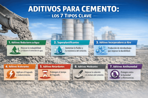 Como ya comentamos, los aditivos para cemento actúan sobre el material antes de que llegue a obra. Se incorporan durante la fabricación industrial y su objetivo es modificar las propiedades del cemento como materia prima: finura, fluidez en silos, tiempo de fraguado, resistencia a distintas edades, o composición química. Los aditivos para concreto, en cambio, se añaden a la mezcla inmediatamente antes o durante el mezclado, junto con el agua, los agregados y el cemento hidráulico.