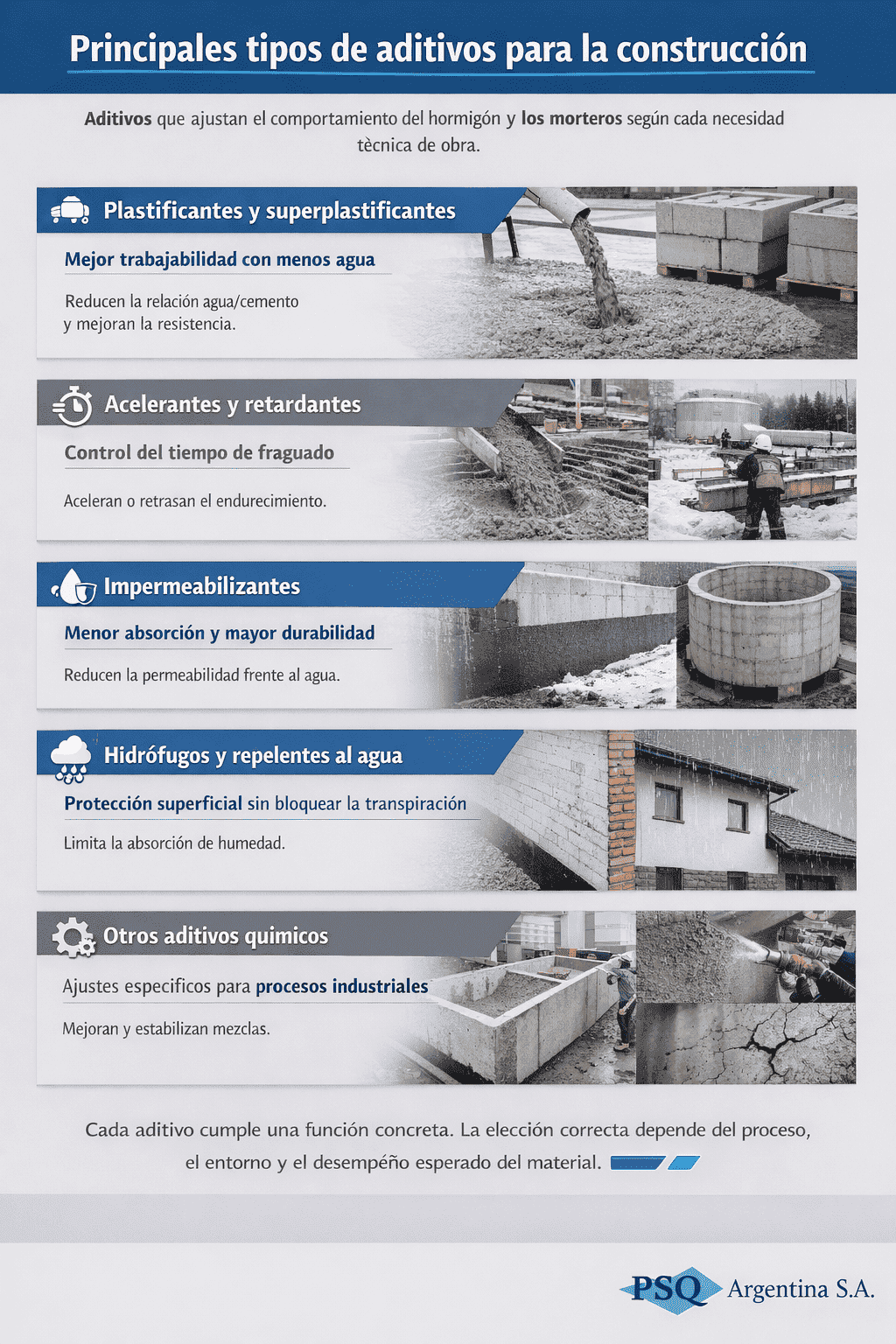 En construcción, los aditivos acompañan al material y al proceso, y su efecto se nota cuando están alineados con la aplicación real. Con ese mismo criterio, en PSQ Argentina desarrollamos y comercializamos soluciones químicas pensadas para usos concretos del sector, donde la elección del aditivo responde a una necesidad operativa clara y a las condiciones reales de trabajo en obra o en planta.