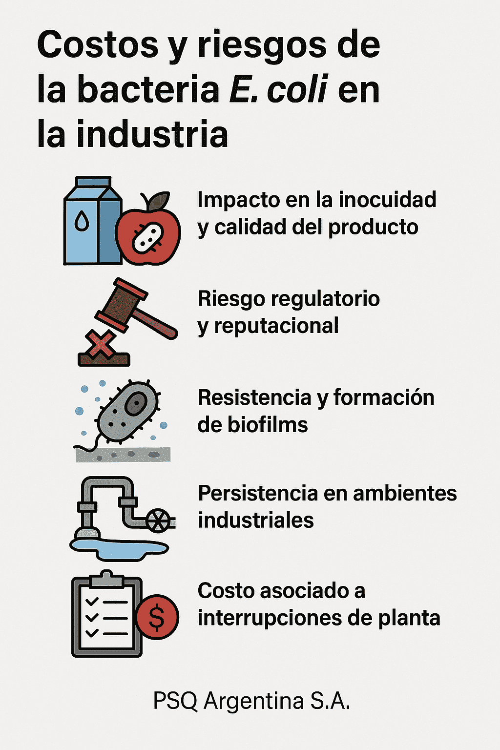 4. Persistencia en ambientes industriales: las condiciones comunes en una planta —humedad, residuos orgánicos leves, rangos de temperatura entre 20 y 45 °C— favorecen la supervivencia y multiplicación de E. coli.