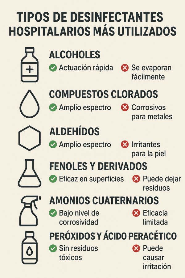 Los desinfectantes hospitalarios son agentes químicos diseñados para eliminar o inactivar microorganismos patógenos presentes en superficies, equipos y materiales dentro de entornos sanitarios. Su función es prevenir infecciones asociadas a la atención de la salud, conocidas como IAAS, una problemática que, según la Organización Mundial de la Salud, afecta a siete de cada diez personas hospitalizadas en el mundo.