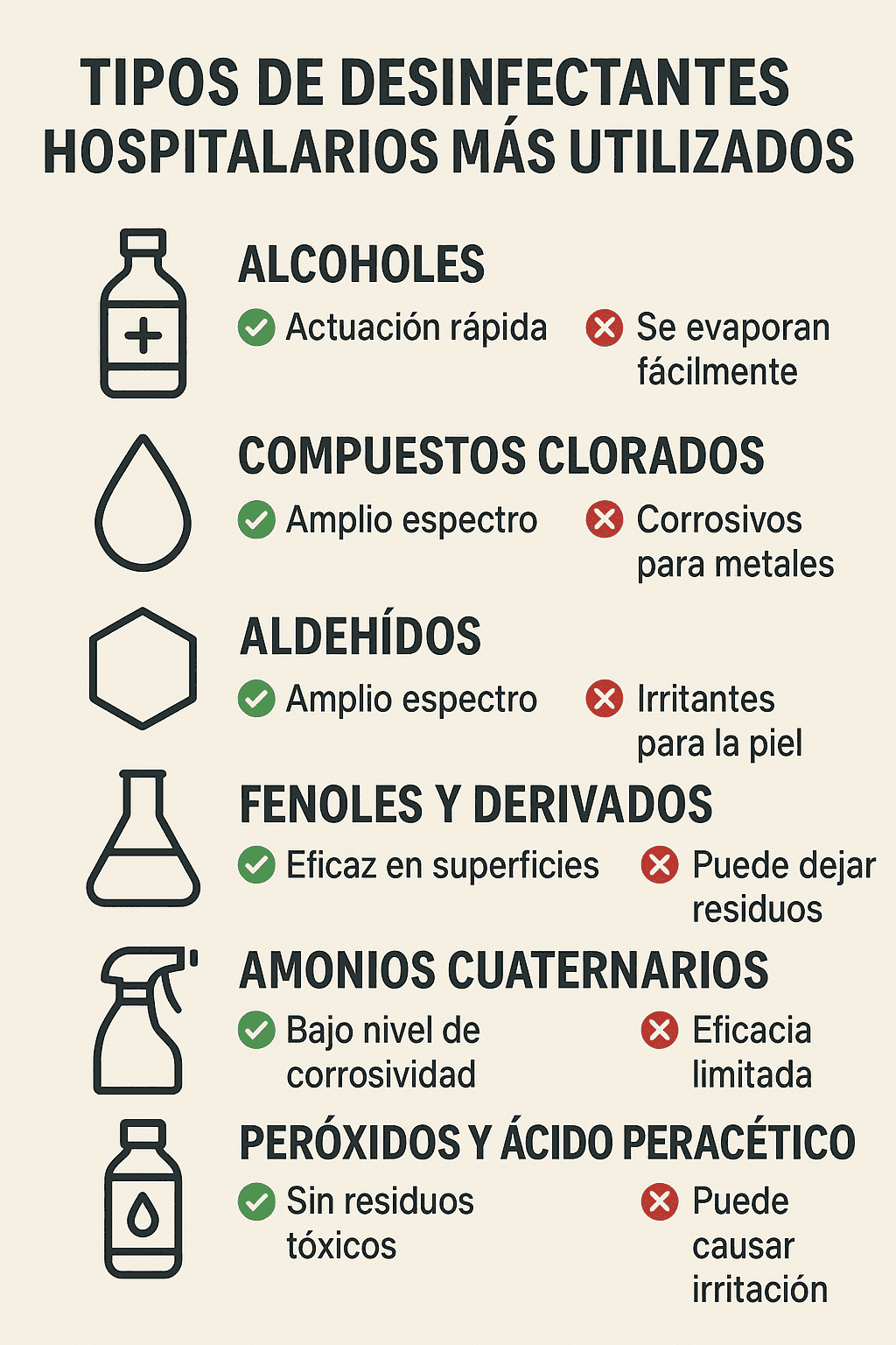 En los hospitales, la elección del agente desinfectante no es casualidad. Cada fórmula responde a una necesidad distinta: rapidez, poder residual, compatibilidad con materiales o eficacia frente a ciertos microorganismos. A continuación, repasamos los tipos de desinfectantes hospitalarios más utilizados, con sus ventajas y limitaciones según las principales guías sanitarias.